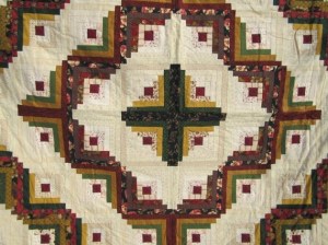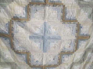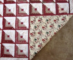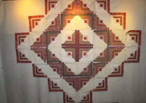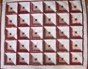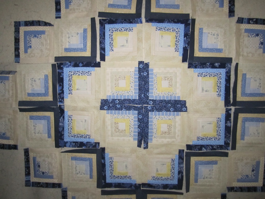 When I am building a quilt, I need to tack it on a wall and see how the pattern emerges and how well the colors work together. I have hung a piece of batting on a wall and the quilting squares stick to it very easily. The log cabin pattern in my favorite because there are many ways to arrange squares within the pattern. This style with the radiating diamonds is called “Barn Raising.” I will use up to 40 different fabrics and it is fun choosing different ones based upon their colors and patterns. I will keep building it out by adding more squares to the perimeter. Once I have it all set, I will sew the squares into rows and the rows into one sheet.