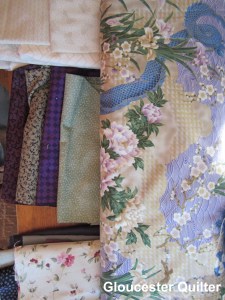 I decided to use a Japanese style fabric pattern for the back to Eggplant and Olive. Now I am working on hand-quilting it.