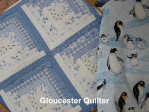 Baby Quilt: Penguin Pride July 1, 2012GloucesterQuilter Leave a comment This one has some nice soft blues and a fun penguin fabric on back. Hand-stitched circles in the center of the log cabin blocks.